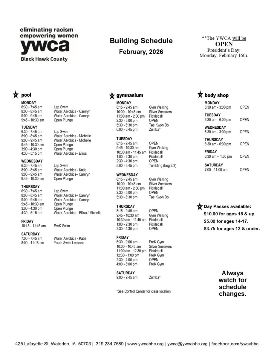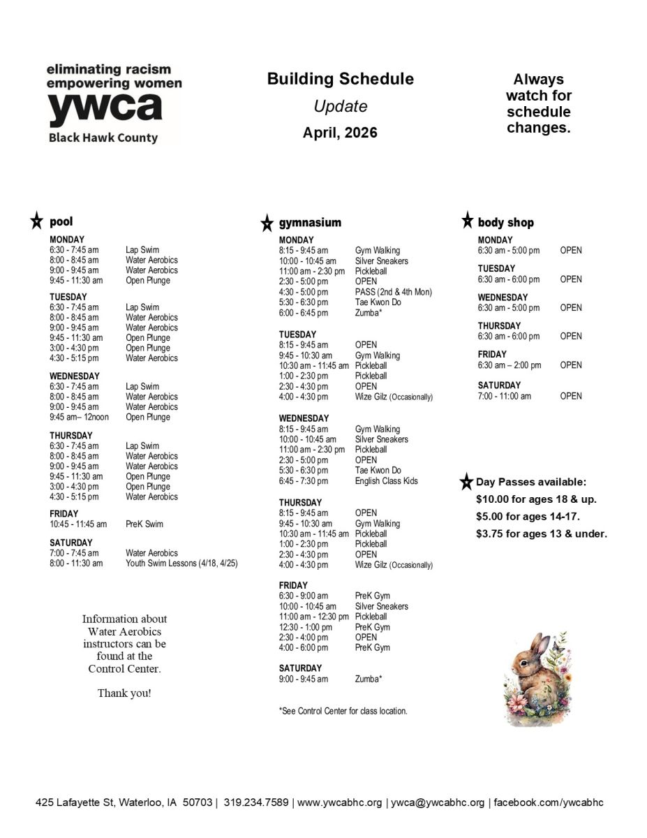 The YWCA Black Hawk County has a new facility schedule every month with possible changes to dates, times, and classes. Please scroll down to see the current schedule.
